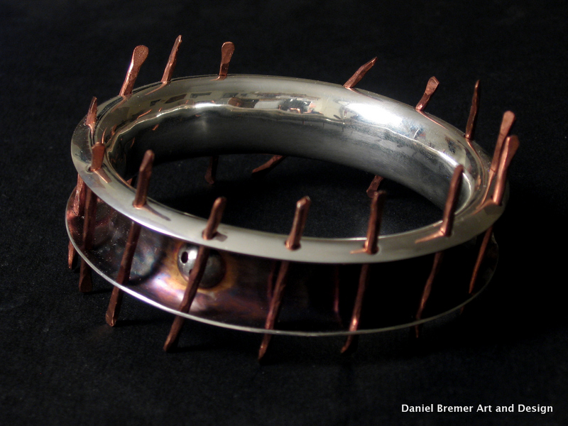 Caged bangle; sterling silver, copper